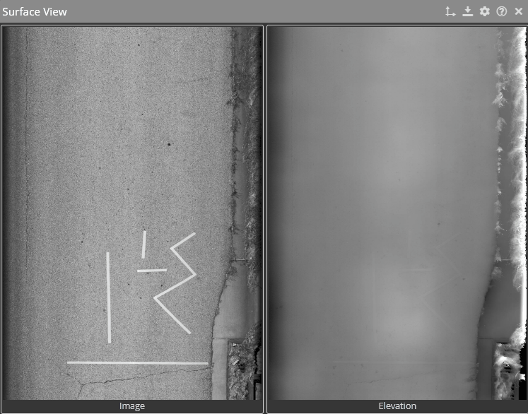 The Image side shows you what the pavement looks like as you would expect from a normal black-and-white camera. The Elevation side shows you the elevation of the pavement. Dark areas are deeper areas (like the bottoms of cracks and potholes) and bright areas are higher areas (like patches or debris).