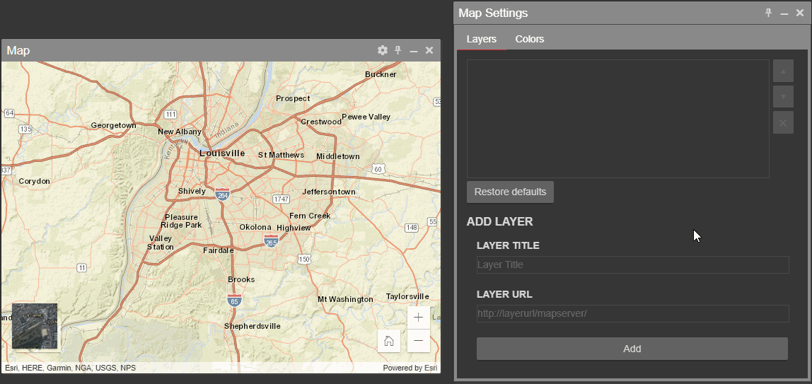 If you have a URL to a custom GIS map service, you can also add these layers to your map. When the map window is open, click on the gear icon in the title bar.