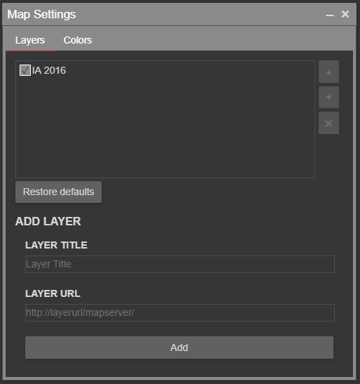 If your layer is obscuring another one, you can turn it off using the checkbox next to the layer’s title. You can also control which layers appear on top of other layers by re-ordering them using the up/down arrow buttons to the right. And finally, you can remove a layer using the X button.